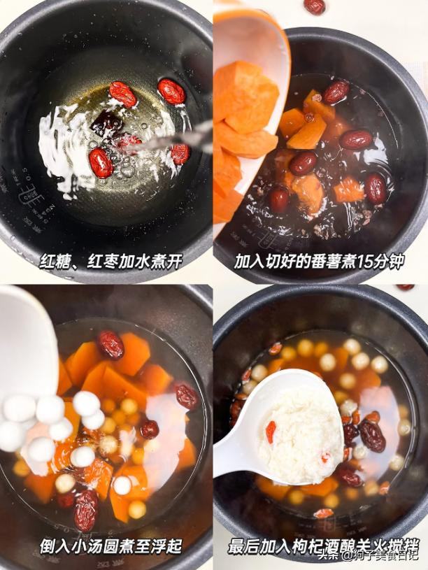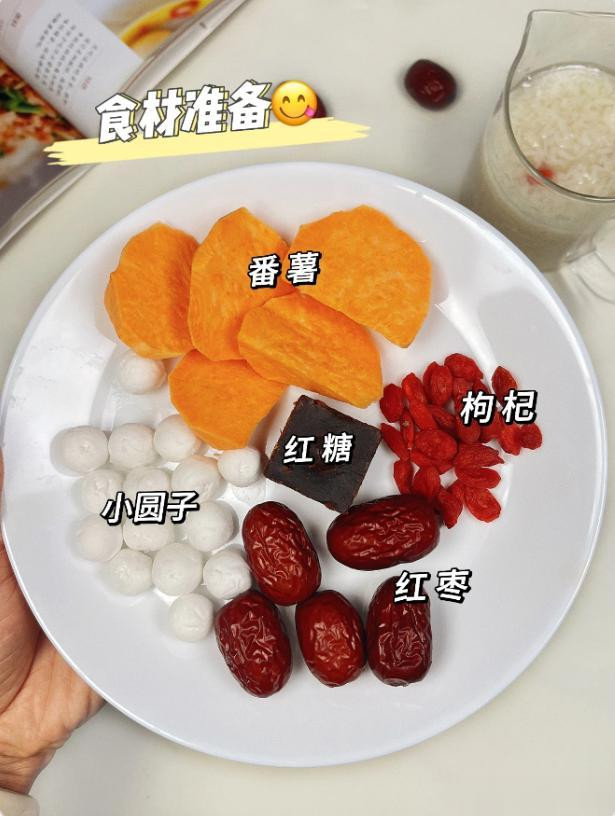 材料:适量红薯,一块红糖,一把枸杞,适量小圆子,适量红枣,一杯酒酿。