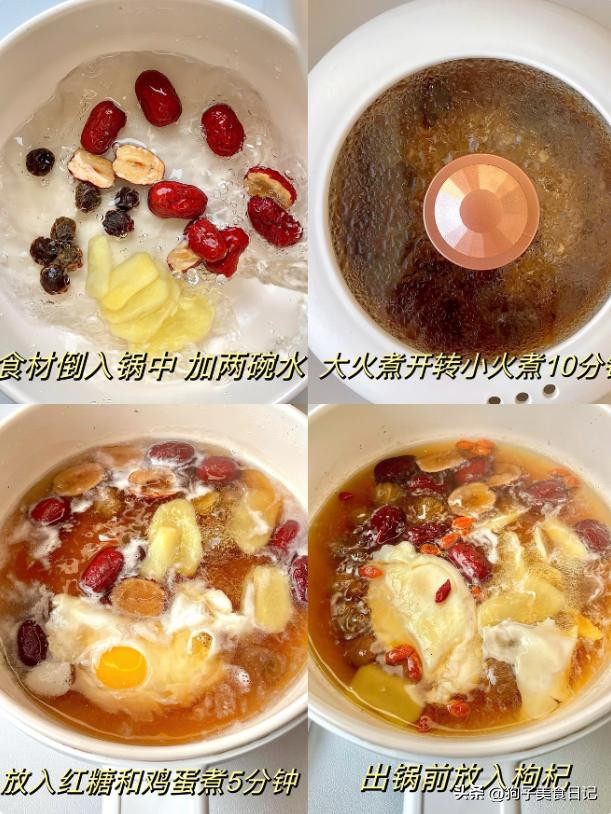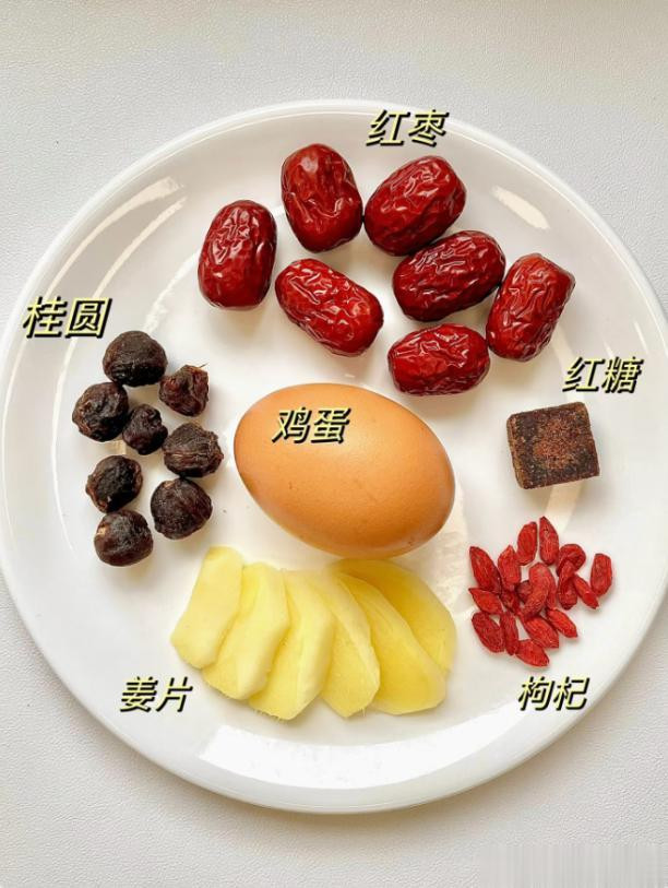 材料:适量红枣,适量桂圆,一个鸡蛋,生姜片,一把枸杞,一块红糖。